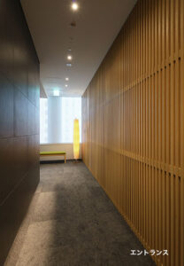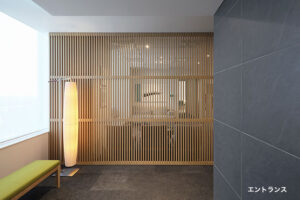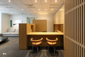 高さ2.8m、長さ7.6mに渡る印象的な格子が患者様を出迎えます。 狭い空間の中で、患者様同士の目線が交錯しないよう、また心理的な逃げ場として、もう一つの空間(長いエントランス)を設けました。 高層ビルの厳しい防火基準をクリアした本物の造作です。