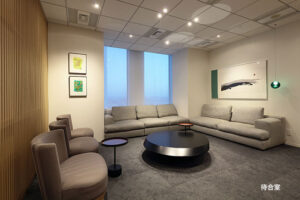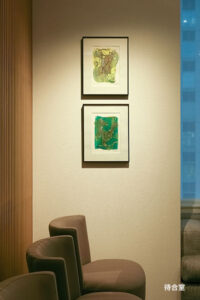 待合の中に、自然界の色合いや広がりを取り入れることを考えました。 中央のセンターテーブルは作家コルビジェによれば、庭石のイメージだそう。 壁にかかる美しい色彩のアートや書と相まって禅庭で瞑想しながらお待ち頂くことをイメージしました。