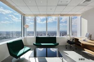 時に緊張を強いられる診察室は自宅にいるような親しみやすさとご家族での診察にそなえ、リビングセットを設えました。 当院のイメージカラーのグリーンは院長の誠実で実直なイメージを表しています。